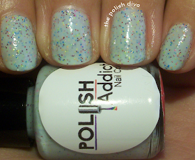 This is from the brand Polish Addict Nail Color, and it is called Unicorn Love. This is a really pretty super light blue, filled with micro rainbow glitters.
